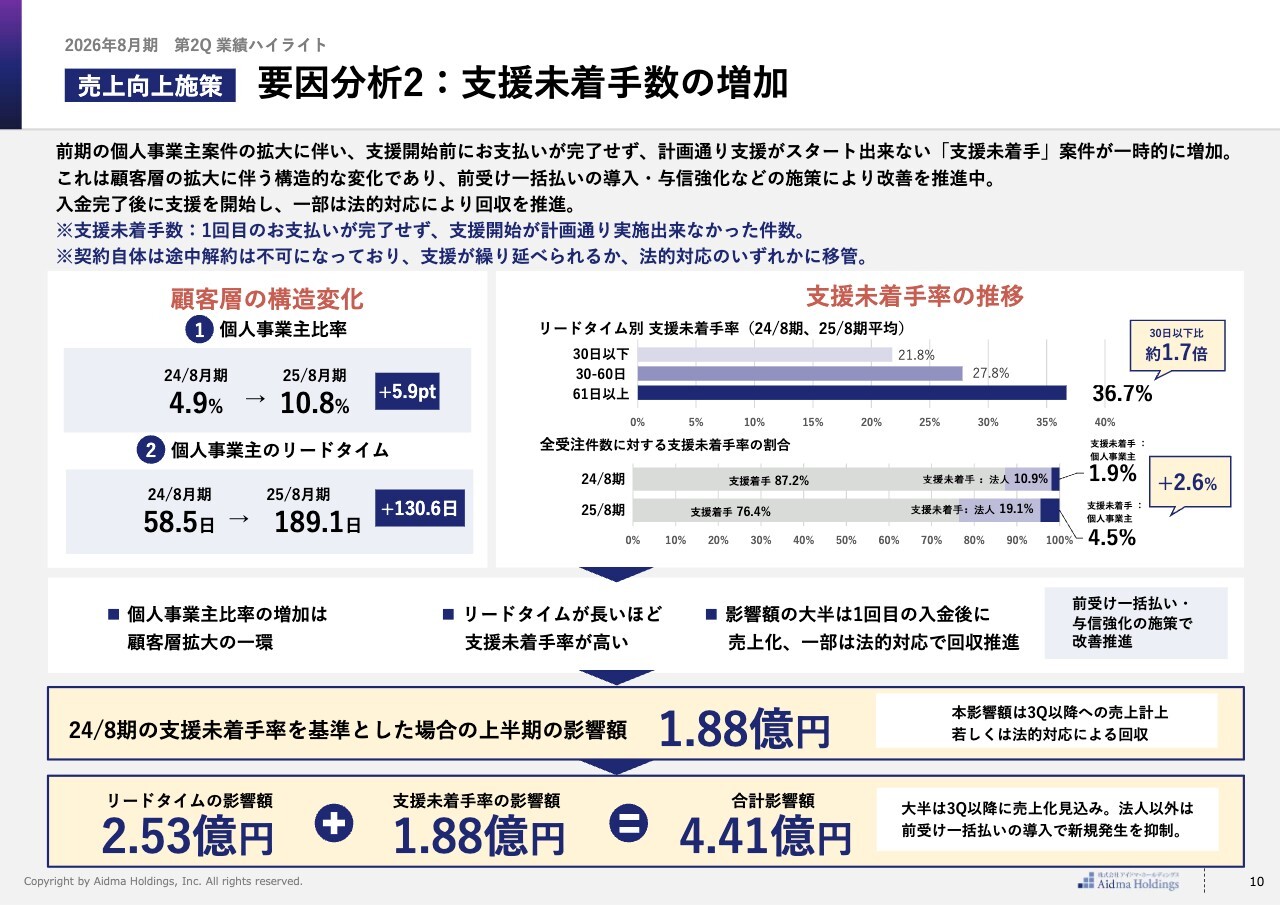 受注全体のリードタイムが長くなっており、売上に反映されるのが第3四半期以降になっていることに加え、第2四半期で着手できる案件が一部後ろ倒しになっているという2つの要素により、第2四半期の売上は第1四半期と比較して減少しています。なお、リードタイム影響額2億5,300万円と支援未着手率影響額1億8,800万円を合計した影響額は、約4億4,100万円となります。その大半は第3四半期以降に売上化する見込みです。