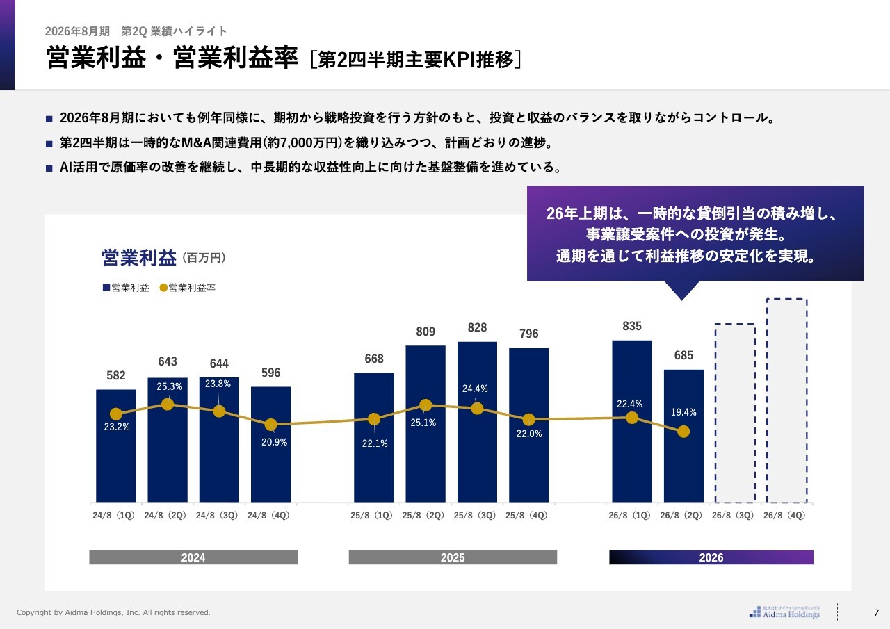 営業利益については、第1四半期に貸倒引当金の一時的な積み増しがありました。第2四半期は第1四半期と比べて減少していますが、当四半期も貸倒引当金の積み増しを若干行いました。