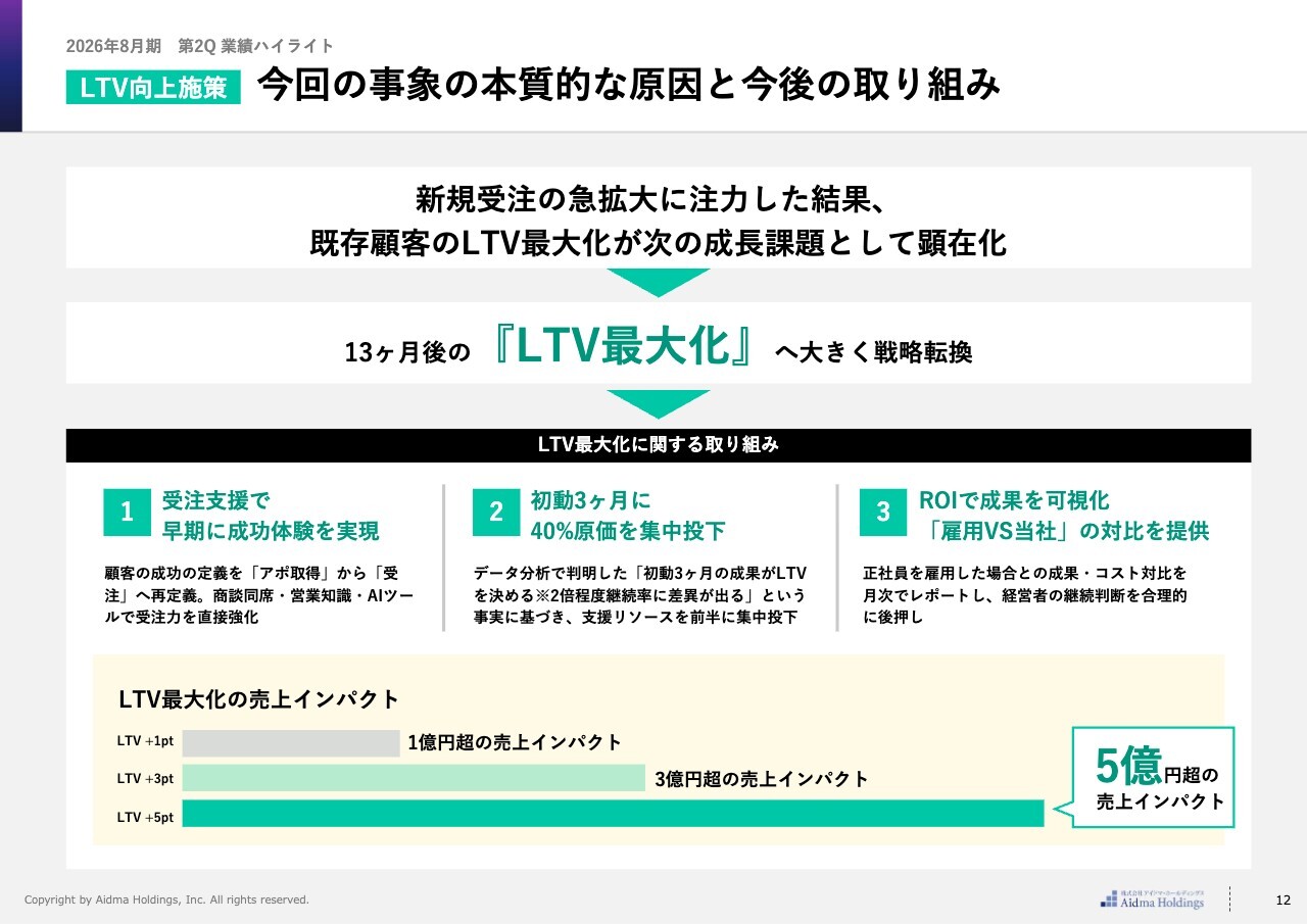 LTVの最大化はすぐにインパクトが出る施策ではありませんが、1年後にはLTVの影響が非常に大きくなると考えています。そのため、全社的に力を入れ、新規受注の増加を図りつつ、体制や人員の増加も含めた戦略転換を進め、強化していきたいと考えています。