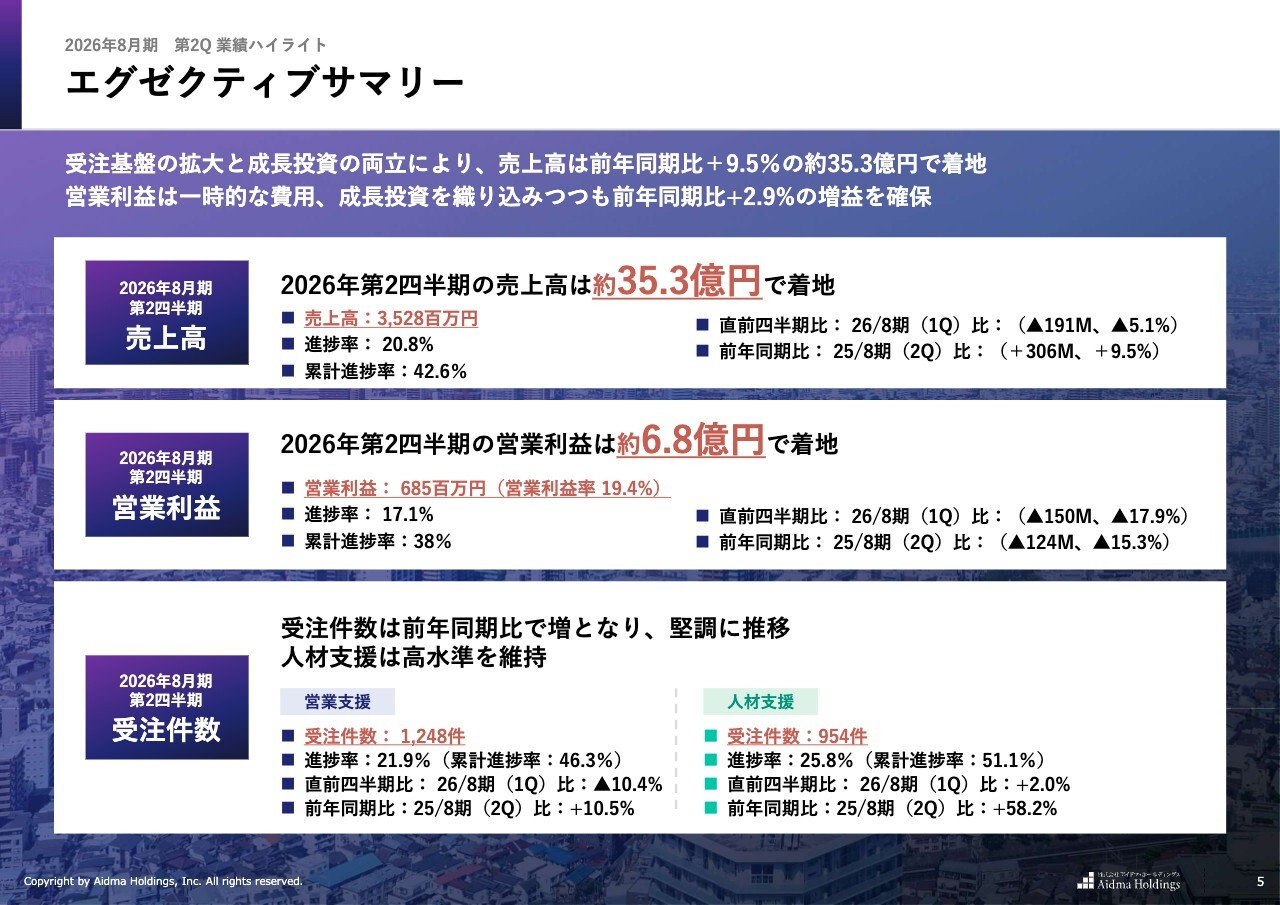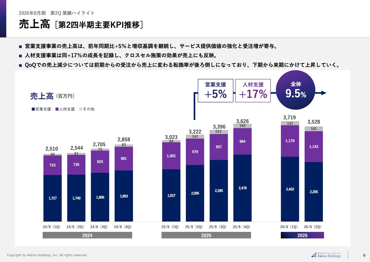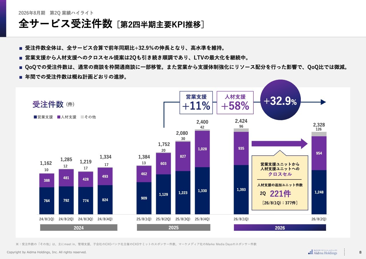 営業支援および人材支援のそれぞれの受注件数は計画どおり順調に進捗しており、前年同期と比較しても伸びています。