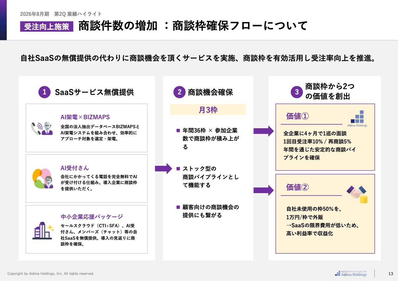 受注件数を増やすための商談枠の確保に向けた取り組みを進めています。具体的には、SaaSサービスをお客様に無償で提供します。