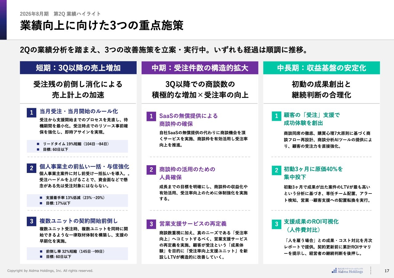 中期的には、受注件数を構造的に拡大するために、商談数を枠から増やしていく取り組みを進めていきます。また、中長期的には収益基盤の安定を図るために、お客様のLTVを最大化することも目指しています。これらの施策を同時に進めながら、第3四半期と第4四半期の当期売上および利益の積み上げを図っていきたいと考えています。