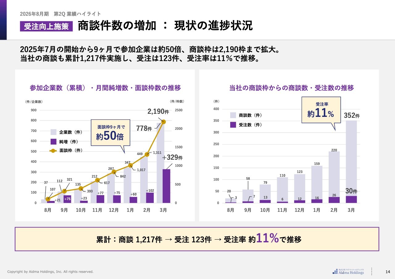 累計で1,217件の自社商談を行い、そのうち123件を受注しました。また、2025年8月のプロジェクトの本格稼働から8ヶ月(3月末時点)で参加企業数は約50倍に増加し、商談枠も2,190枠まで拡大しています。