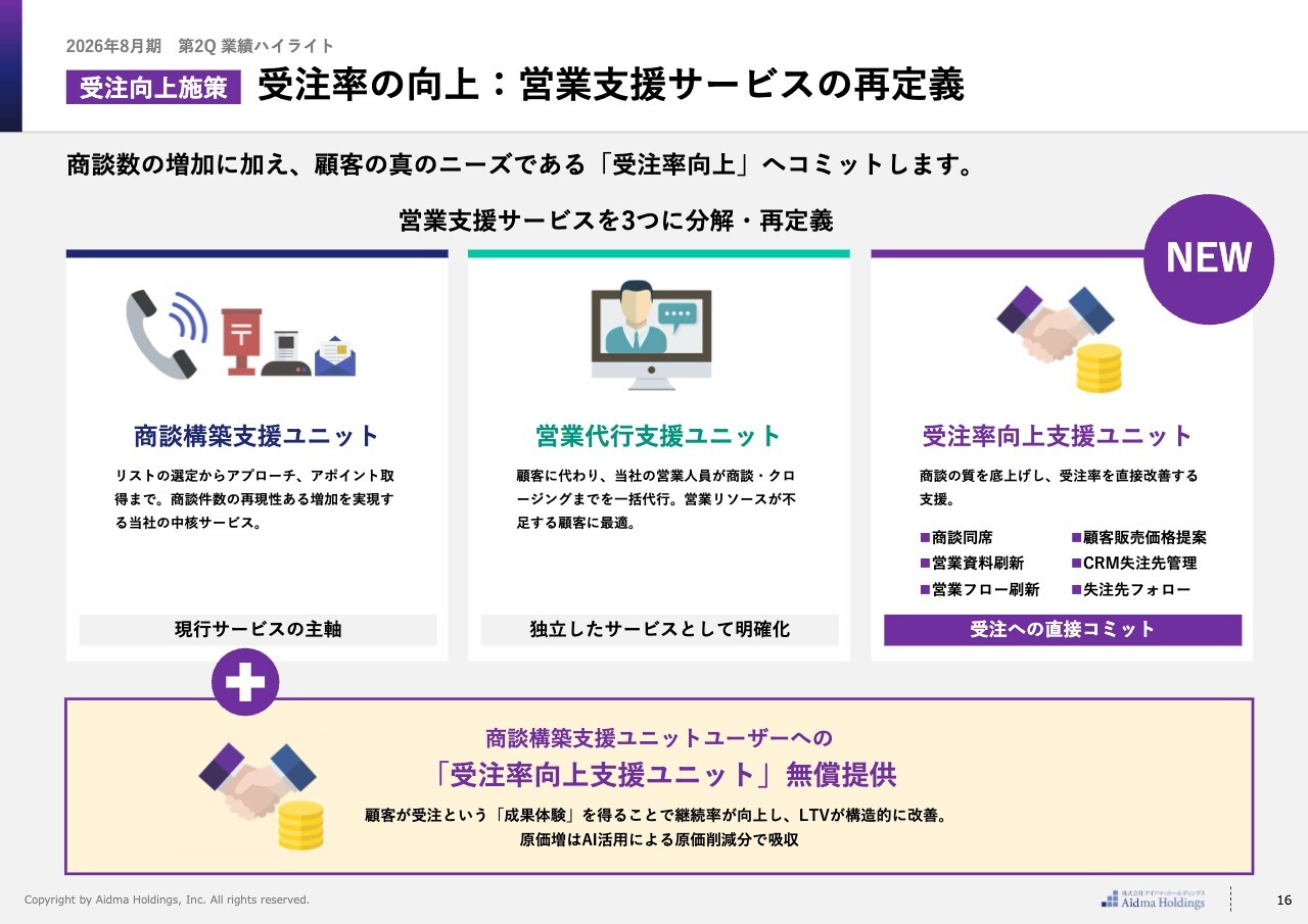 主力サービスである営業支援サービスについては、お客様の真のニーズである受注率向上にコミットします。商談構築支援ユニット、営業のアウトソーシングとして商談を代行する営業代行支援ユニット、受注率向上支援ユニットの3つに分解し、それぞれをサービスとして展開します。現在の主力商材である商談構築支援ユニットに対しては、受注率向上支援ユニットを無償で提供することで、LTVの最大化を目指します。