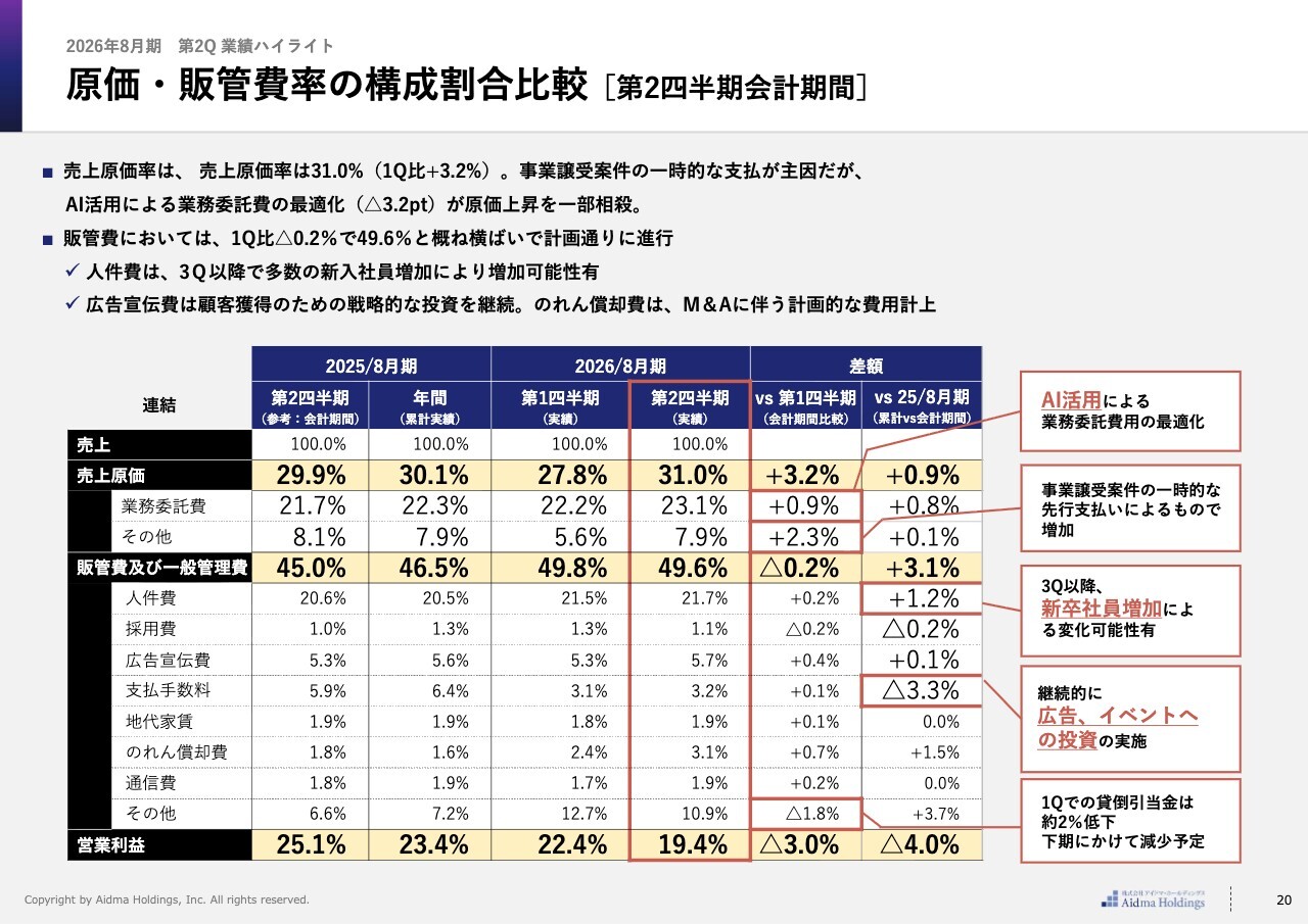 まず、売上原価についてご説明します。前四半期比におけるその他の増加率については、第3四半期以降に向けた先行的な投資が大きな割合を占めています。下期以降の売上・原価の最適化が進むにつれ、原価率は低減していく予定です。