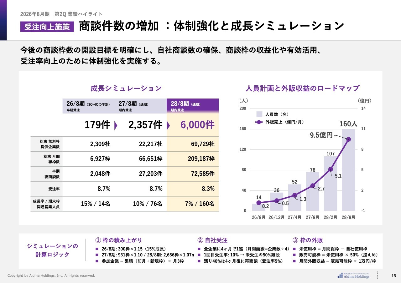 2028年8月期は、通常の受注とは別に、こちらの「中小企業応援パッケージ」からの受注件数を6,000件とする計画を立てています。最終的には、2028年8月期末に無料枠提供企業数を約7万社、総枠数を約21万枠、そのうち当社が商談を実施する件数を約7万2,000件と見込んでいます。受注率は8.3パーセントで計算し、6,000件の受注を積み上げていくことを目指しています。