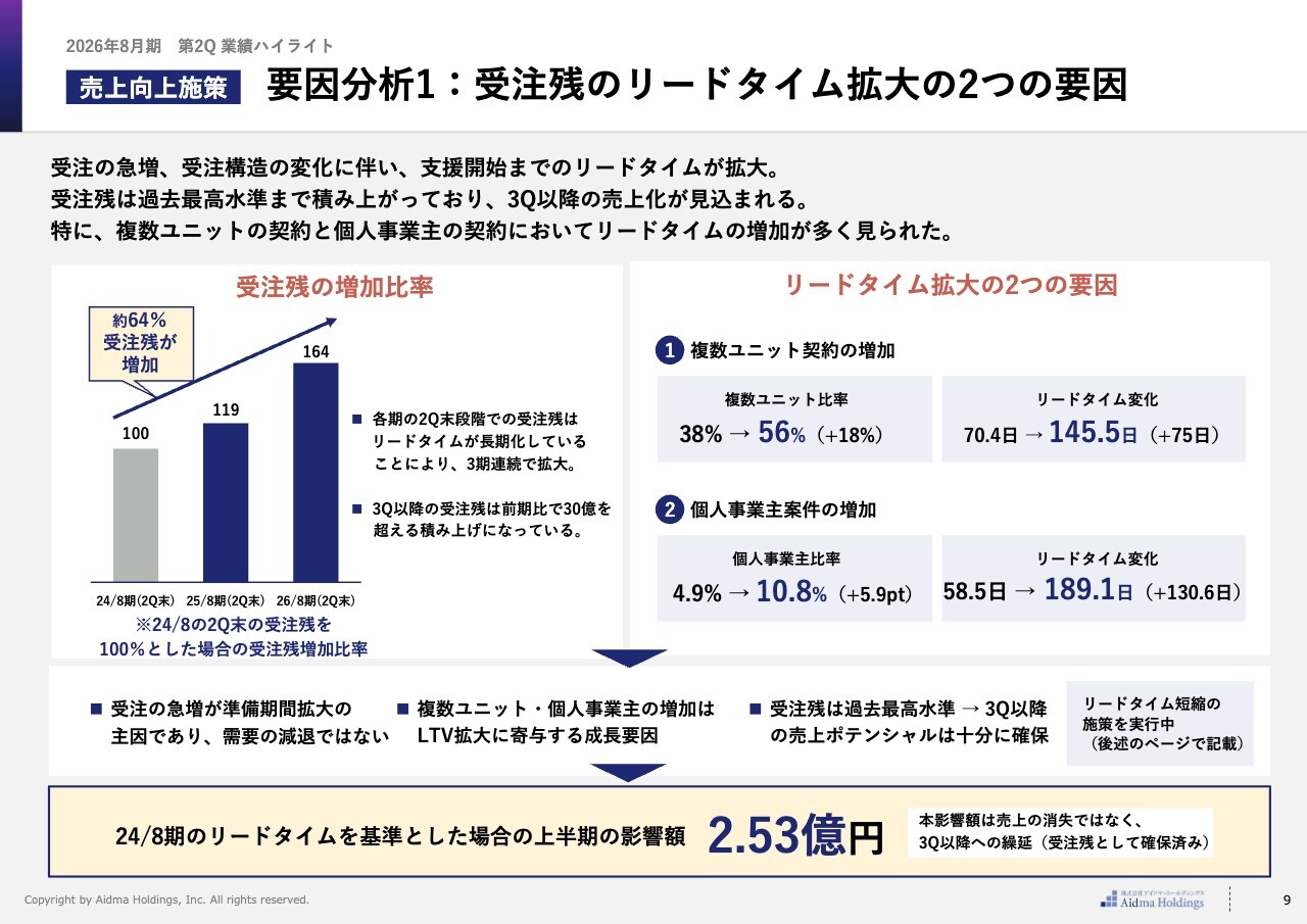 現状の前四半期比での売上減少は、リードタイムの増加と支援未着手率の上昇の2点が主な要因です。第3四半期からは改善が進んでおり、現時点でも改善が見られています。また、受注残も第3四半期以降に積み上がっていくため、売上増加に寄与すると考えています。