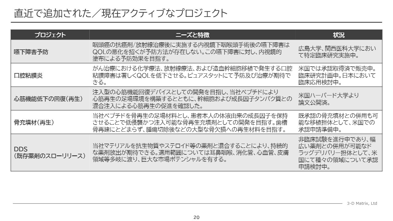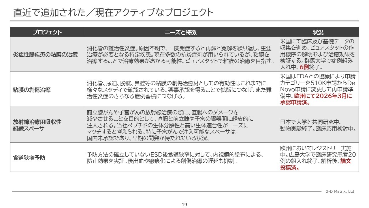 また、前回もご報告しましたが、上から2つ目に記載している粘膜の創傷治癒については、米国ではカテゴリーを510(k)申請からDe Novo 510(k)申請に変更して申請準備を進めています。欧州においては、今年3月に承認申請を完了した状況です。