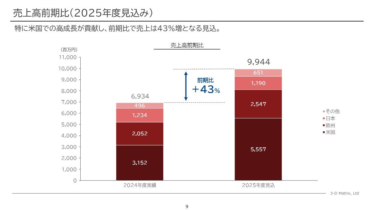 売上高の2025年度見込みです。特に米国での高成長が貢献し、売上高は前期比で43パーセント増の99億4,400万円を達成する見込みです。