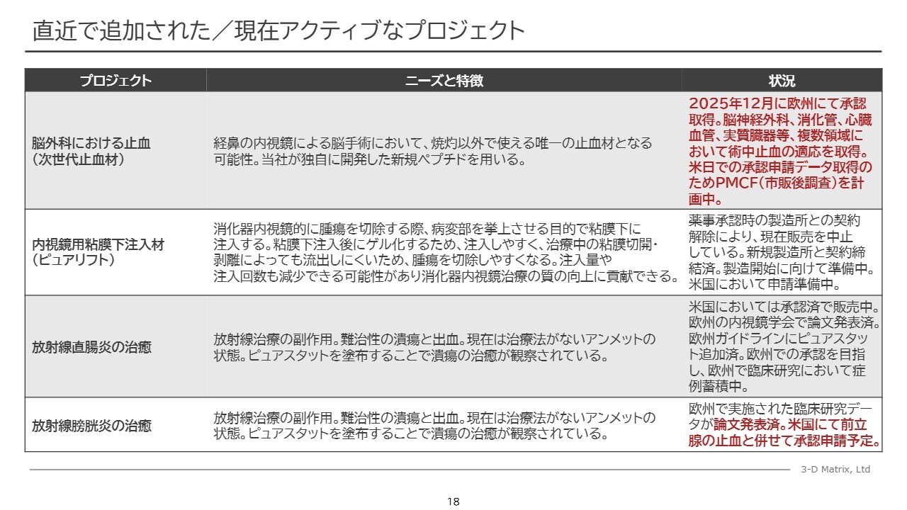 次にスライド上段に記載している脳外科における止血(次世代止血材)についてご説明します。こちらは、昨年12月に欧州で承認を取得しました。
