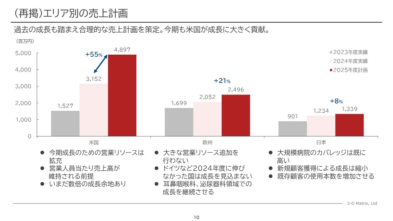 エリア別の売上計画について、あらためてお伝えします。今期、アメリカでは前期比55パーセント増となる約49億円、欧州では前期比21パーセント増となる約25億円の売上高を計画していました。