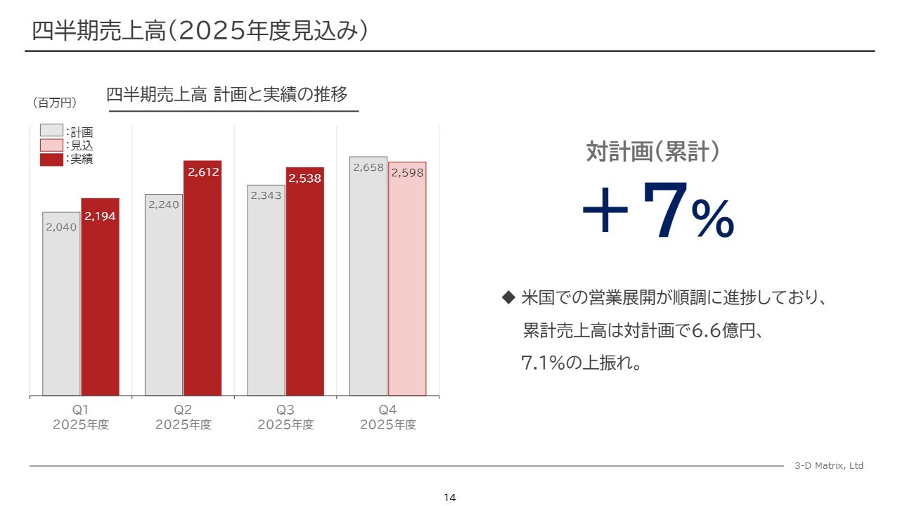 四半期ごとの売上高です。年度累計では、計画比7パーセント増で推移しています。米国での営業展開は順調に進んでおり、累計売上高は計画比6億6,000万円増と、7.1パーセント上振れると見込んでいます。