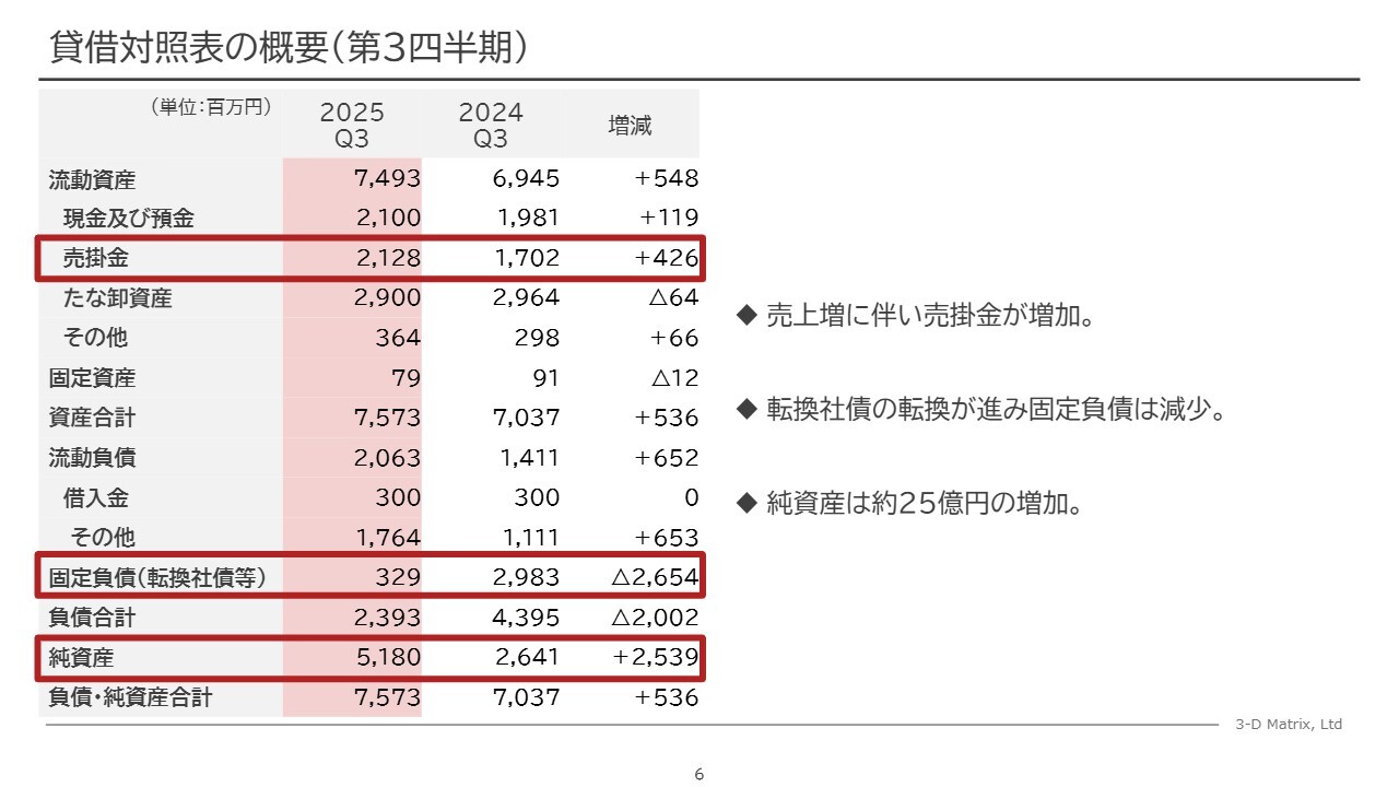 第3四半期末の貸借対照表です。売上増に伴い売掛金が増加しました。また、転換社債の転換が進んだことで固定負債が3億円まで減少しています。純資産は前年同期比で約25億円増加し、約51億円となりました。