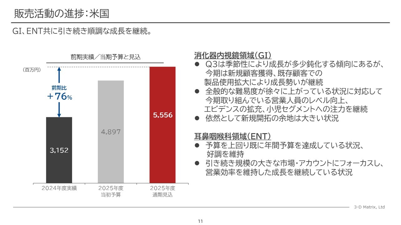 耳鼻咽喉科領域(ENT)は予算を上回っており、第3四半期時点で年間予算を達成するなど、好調を維持しています。引き続き、規模の大きな市場やアカウントにフォーカスすることで、営業効率を維持した成長を続けています。