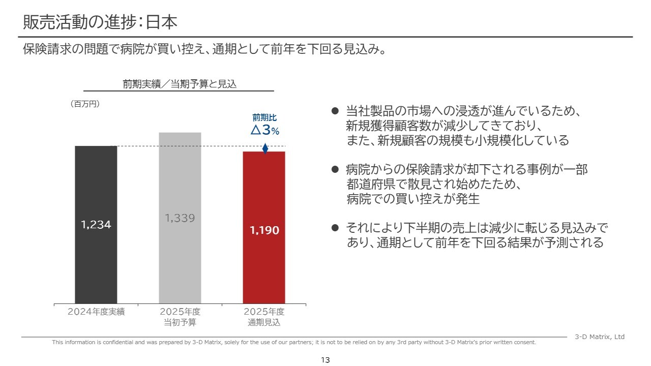 この影響により、病院では買い控えが発生し、下期の売上は減少に転じる見込みです。その結果、通期として前年を下回る結果が予想される状況です。