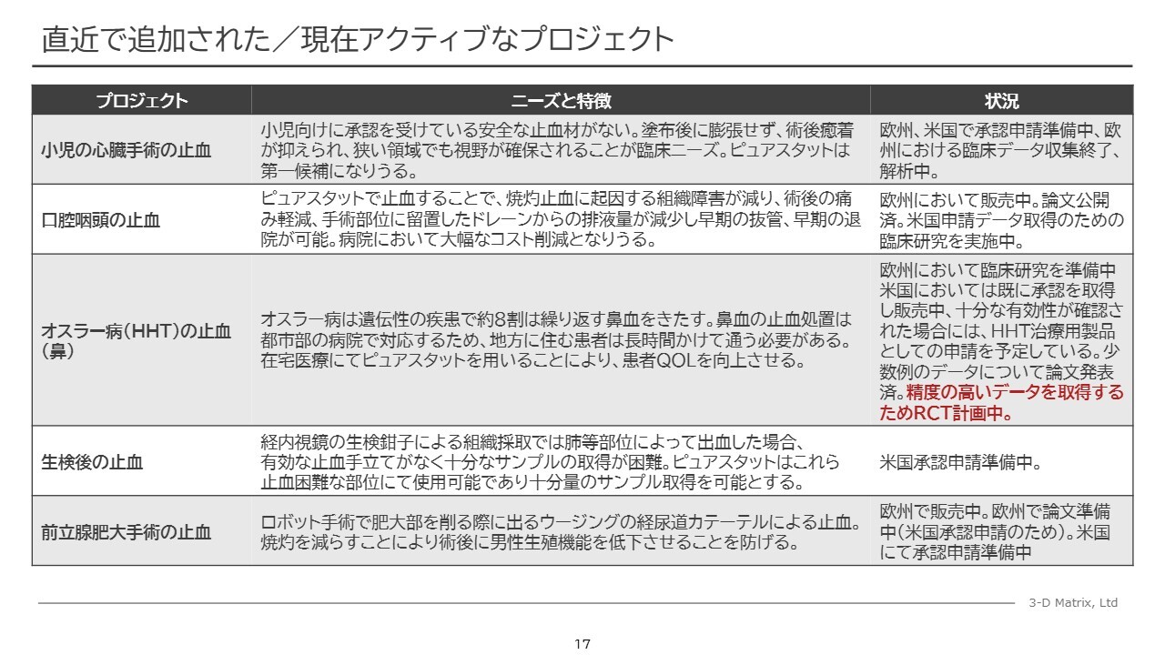 まず、上から3つ目に記載しているオスラー病(HHT)の止血についてです。現在販売中ですが、十分な有効性が確認された場合には、HHT治療用製品として申請を予定しています。