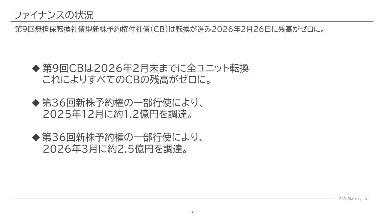 ファイナンスの状況です。第9回CBは今年2月末までに全ユニットが転換され、これによりCBの残高および固定負債がゼロとなりました。