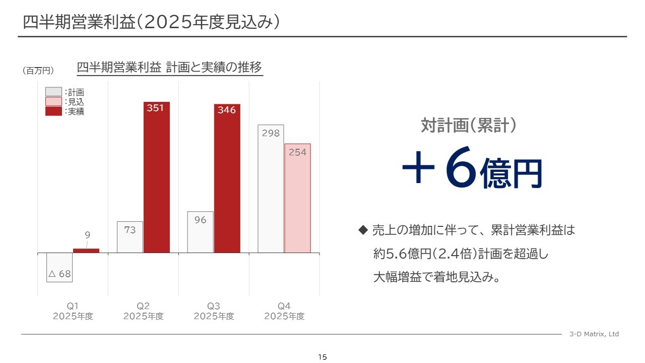 売上高の増加に伴い、累計営業利益は約5億6,000万円と、計画を2.4倍超過し、大幅増益で着地する見込みです。第4四半期に関しては予算を下回る計画ですが、これは費用を保守的に見積もった結果です。