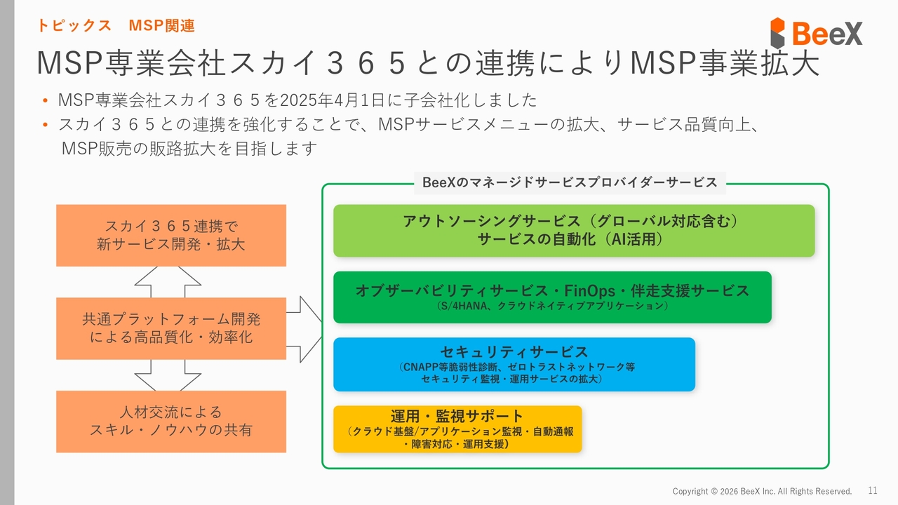次に、MSP関連では、先ほど触れたスカイ365との連携を強化し、ベトナム拠点などを活用した新しいサービスの展開や顧客獲得を目指していきます。