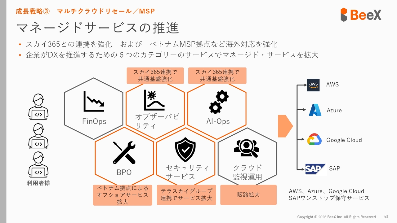 マネージドサービスの推進についてです。当社は、これまでクラウドの監視運用をコアビジネスとして展開していましたが、近年ではそれにとどまらず、セキュリティサービスやBPO(ビジネス・プロセス・アウトソーシング)にも力を入れています。お客さまのIT運用業務を、ベトナム拠点などを活用して顧客業務の巻取りなどを行い、BPOビジネスなどを拡大していきます。