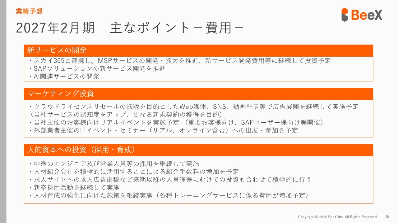 費用面についてお話しします。まず新サービスの開発についてです。当社は「スカイ365」と連携し、海外進出や拠点の展開を行ってきました。今期も海外拠点を活用した新たな開発や、AIを活用した「AIOps」というサービスの開発に継続的に投資する予定です。