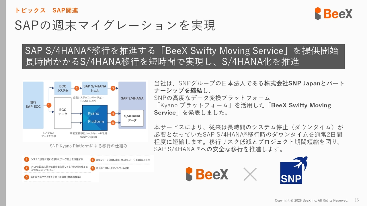 しかし、今回、ドイツのツールベンダー「SNP」と連携することで、週末である土日の2日間で非常に大規模なシステムを移行できる仕組みを新たにリリースしました。