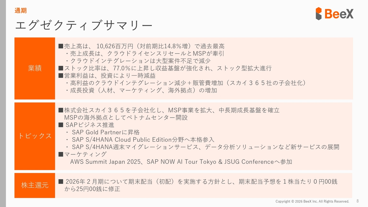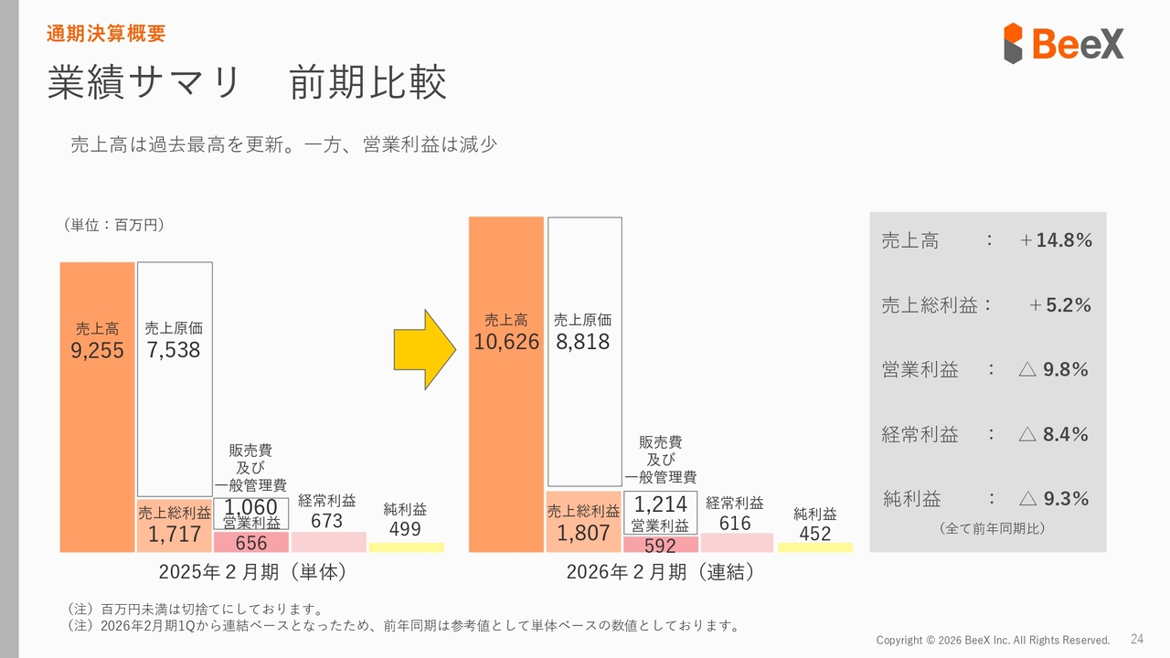 広木太氏:みなさま、こんにちは。株式会社BeeX代表取締役社長の広木太です。本日は、2026年2月期通期の決算についてご説明します。