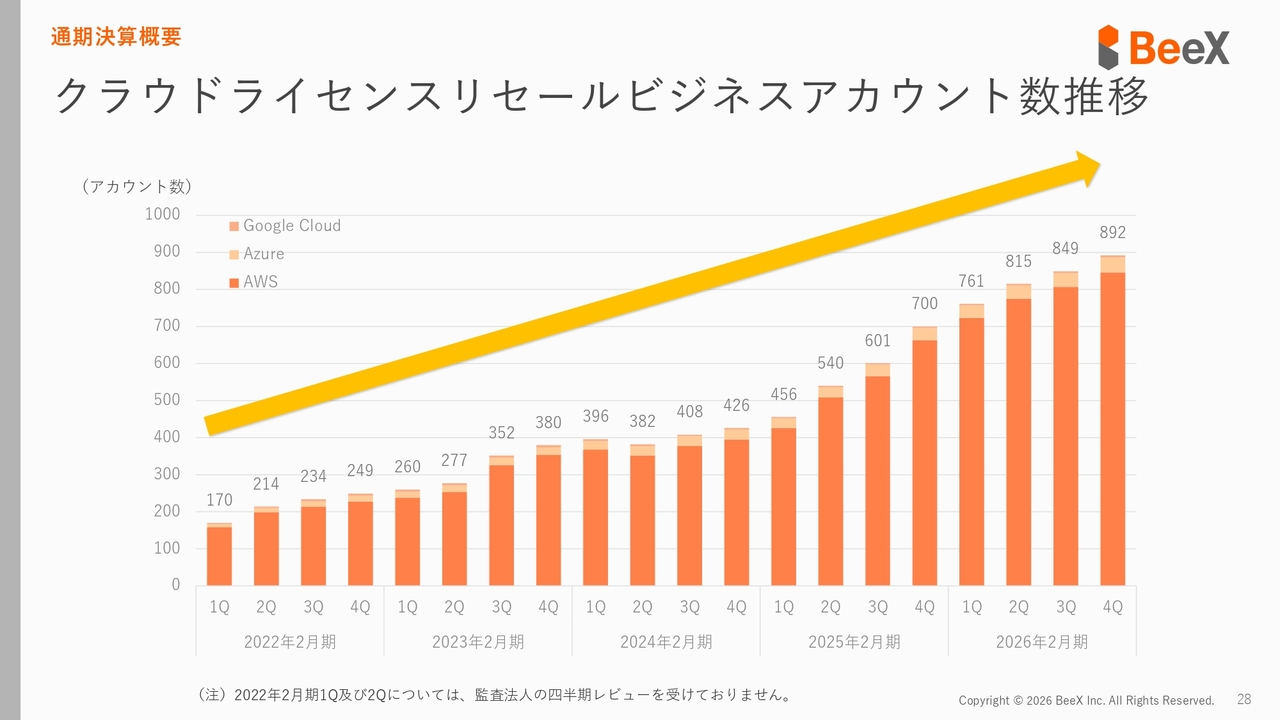 クラウドライセンスリセールアカウント数も前期の700から892と大きく増加しています。また、ストック比率は77パーセントに上昇しています。