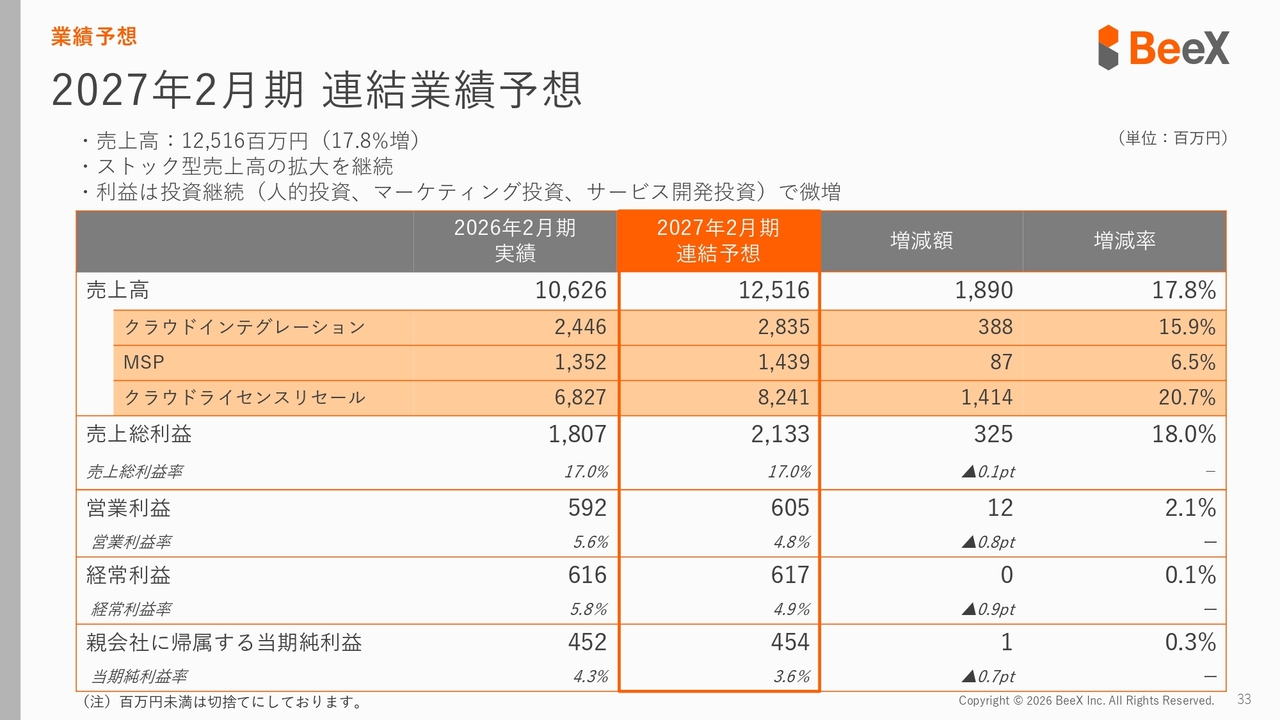 2025年2月期末のアカウント数は700件で、2026年2月期末には892件と大幅に増加しているのが確認できます。アカウント数の増加に伴い、今後さらに売上が拡大していくと考えています。その結果、2027年度も継続的なライセンス売上の成長が期待できると見込んでいます。