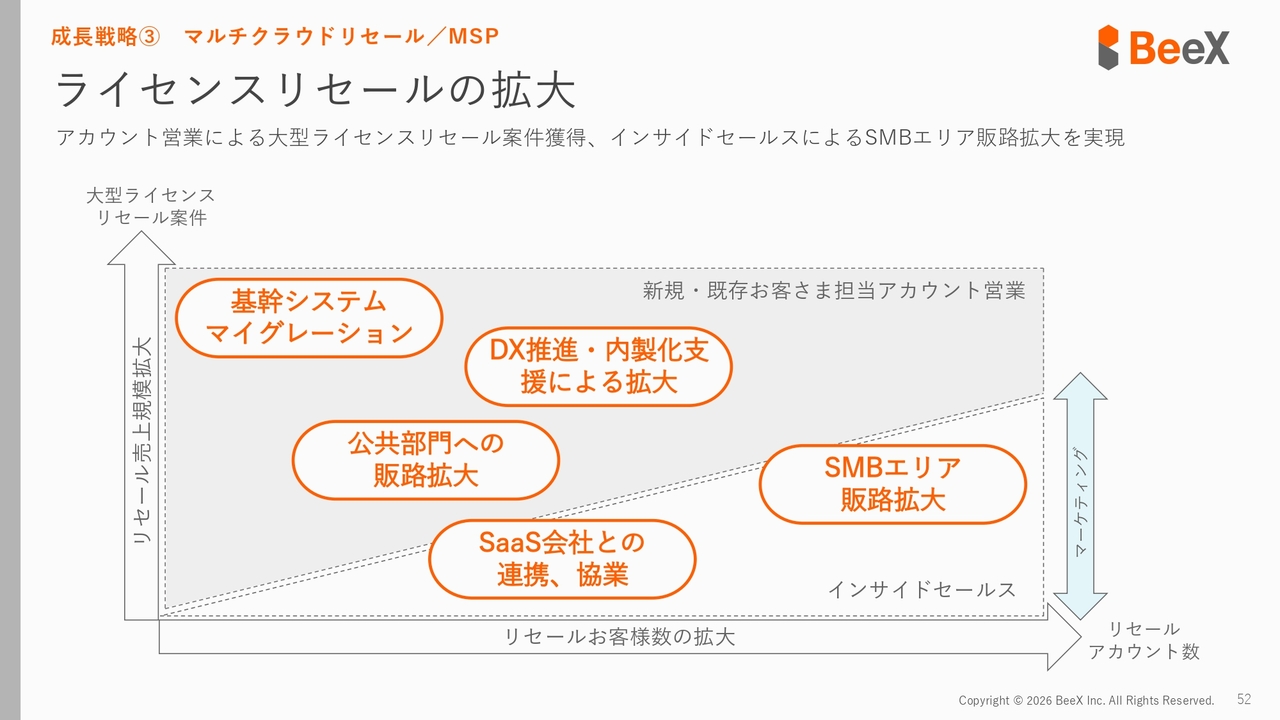SMBエリアや公共エリアといった新しい販路の拡大はもちろんのこと、大型案件や大型ライセンスリセールについても、昨期獲得した実績を踏まえ、今期も継続して獲得を目指していきたいと考えています。