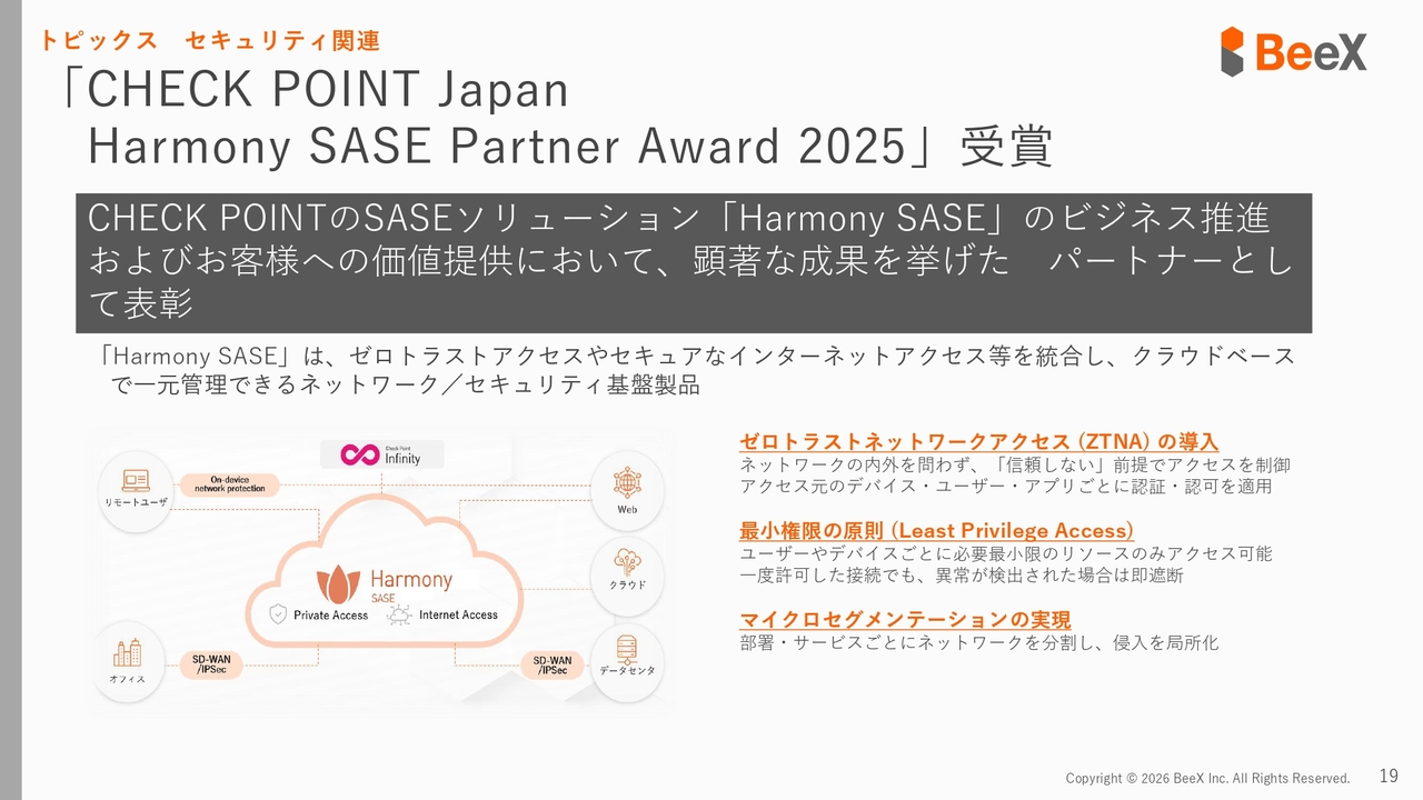 セキュリティ関連のトピックスを2つお話しします。まず1つ目は、Check Point社の「CHECK POINT Japan Harmony SASE Partner Award 2025」を受賞した件です。