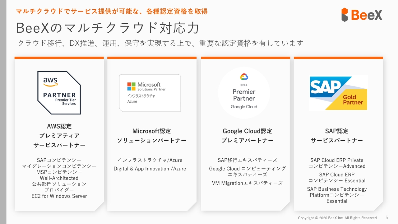 特に「AWS」に関しては、創業当初からSAPの移行など基幹システムの移行に幅広く対応してきた実績をAWSから評価され、現在最上位パートナーである「プレミアティアサービスパートナー」というランクに認定されています。