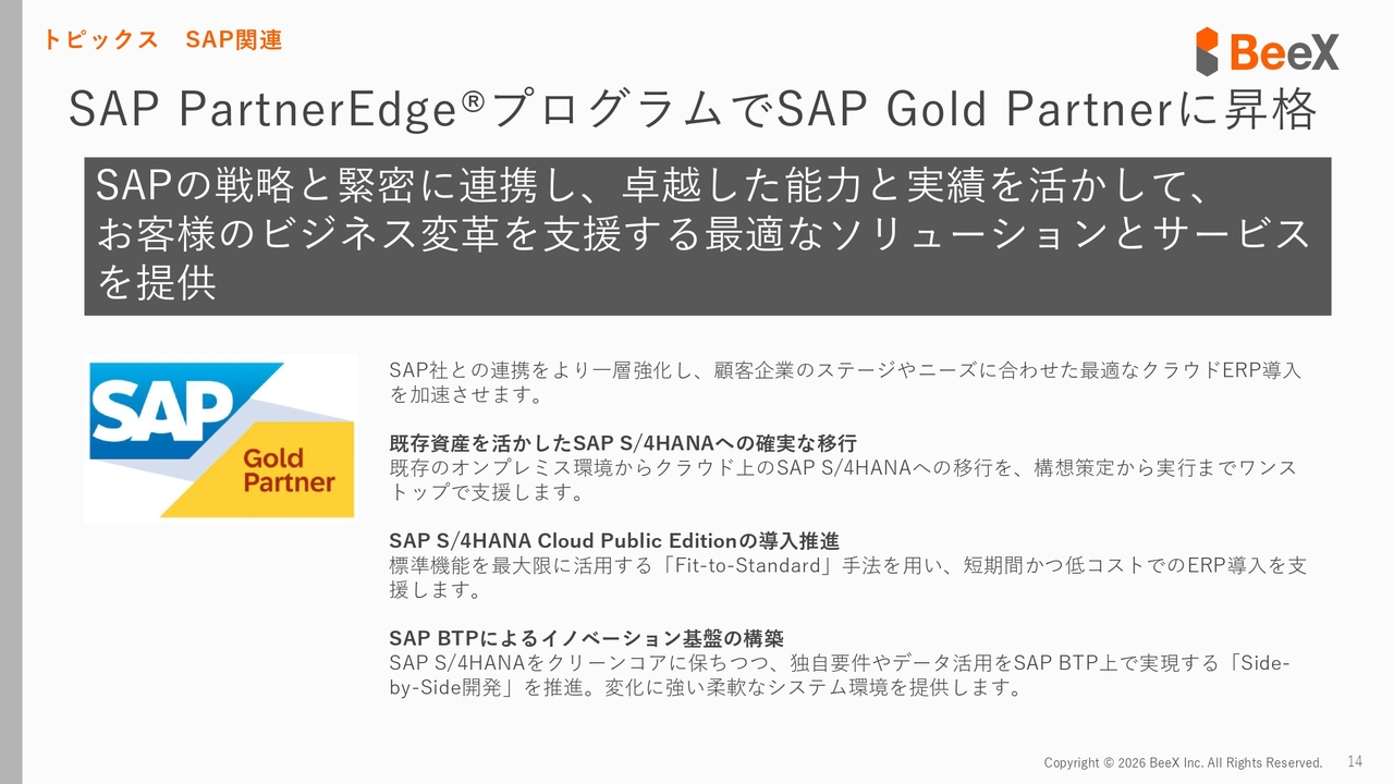 我々のコアビジネスであるSAPビジネスについても推し進めています。まず1つ目として、「SAP Gold Partner」に昇格しました。これまで当社は「SAP Silver Partner」という位置付けでしたが、幅広い対応を行ってきたことをSAPに評価され、「SAP Gold Partner」に昇格しました。