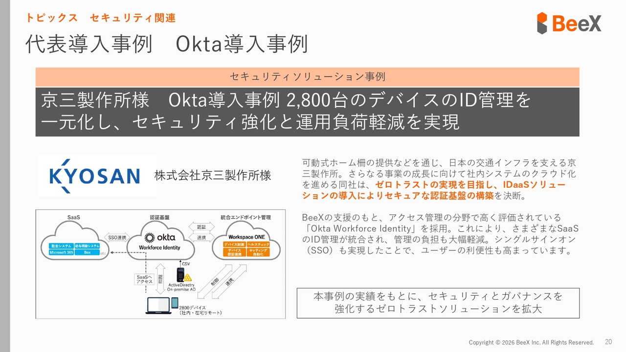 このIdentity管理において、世界的に最も著名で高機能とされている「Okta」という製品があります。我々は、この「Okta」を使った導入事例も今回発表しました。具体的には、2,800台を超えるデバイスの管理を実際に導入・運用しています。