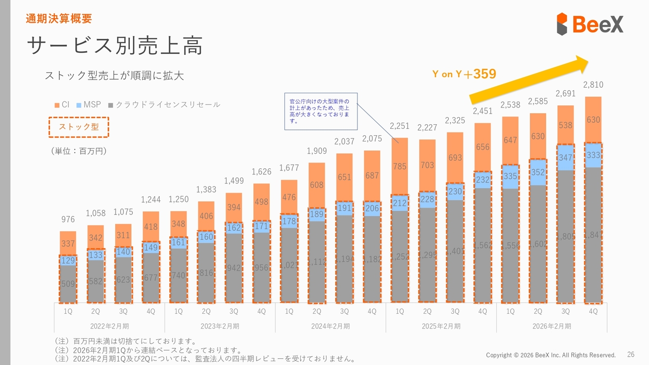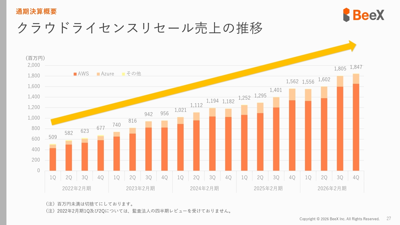 さらに分解してご説明します。まず、クラウドライセンスリセールの売上については、継続した成長ができています。2025年2月期末と2026年2月期を比較すると、大きく伸びていることがグラフからも確認できます。