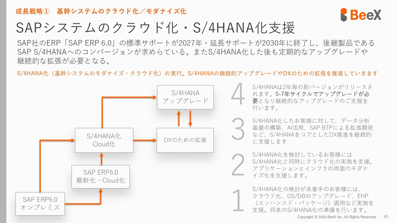 こちらは、我々の会社が継続的に取り組んでいる分野です。基幹システム「SAP」のクラウド化をはじめ、現在「ERP6.0」と呼ばれているお客さまが使用中のバージョンについては、標準サポートが2027年、延長サポートが2030年で終了する予定です。そのため、後継製品である「S/4HANA」への移行を最優先で推進しています。