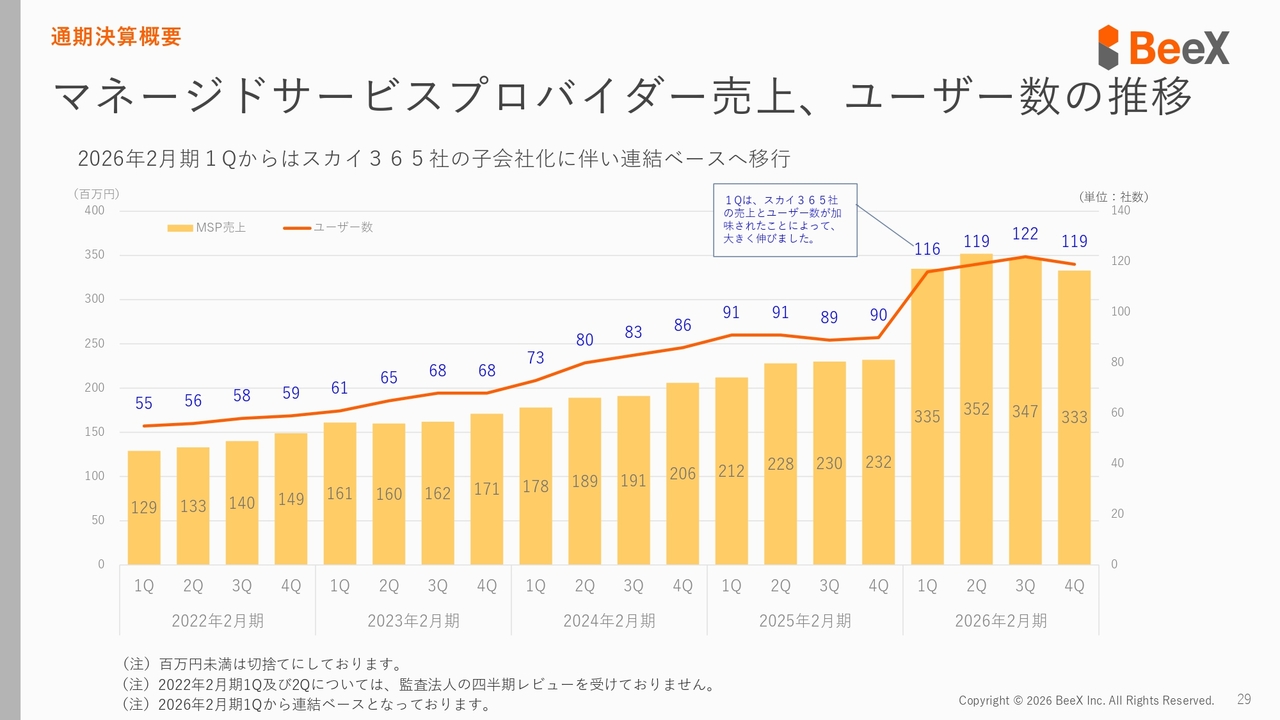 ストック型ビジネスであるマネージドサービスプロバイダーの売上およびユーザー数です。こちらのユーザー数は顧客数を指しており、スカイ365の子会社化により大きく伸びています。