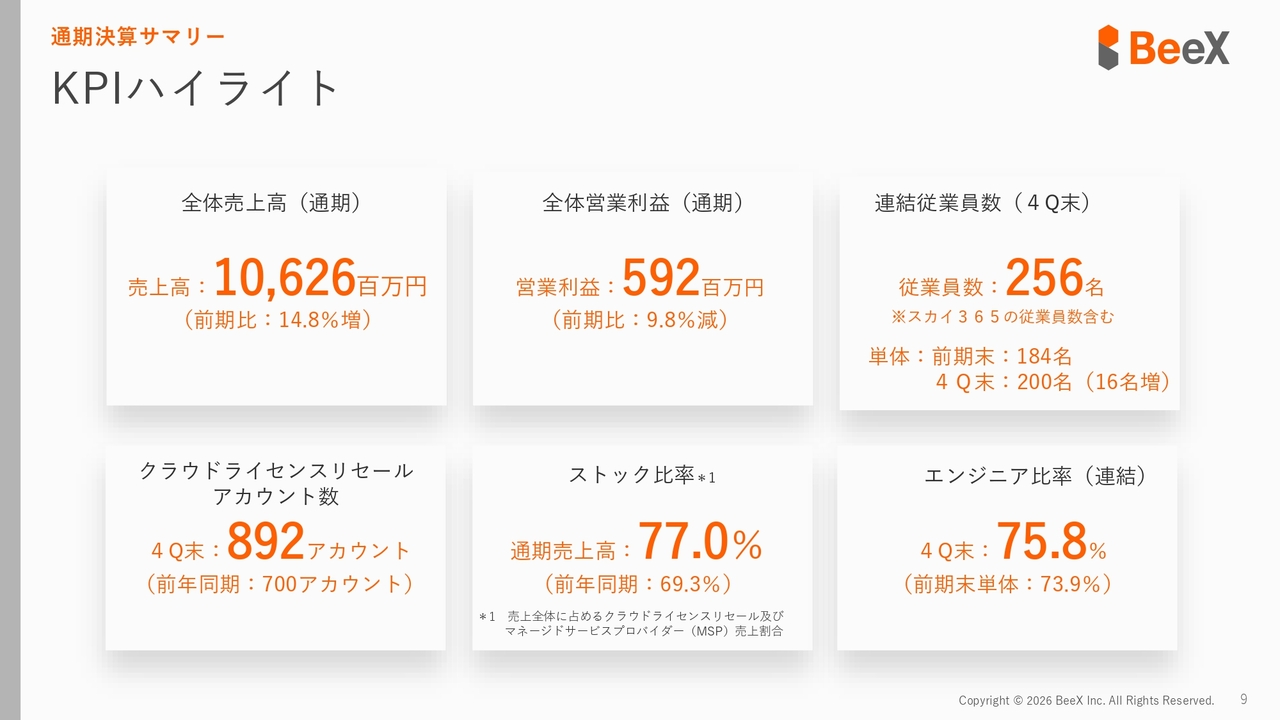 まず業績についてです。売上高は106億2,600万円で、前期比14.8パーセント増となり、過去最高の売上を記録しました。100億円を超える売上を達成したことが特筆すべき点です。また、ストック収益の比率が77パーセントに上昇し、安定した売上収益を強化できたことが、当社として非常に大きな成果だと考えています。