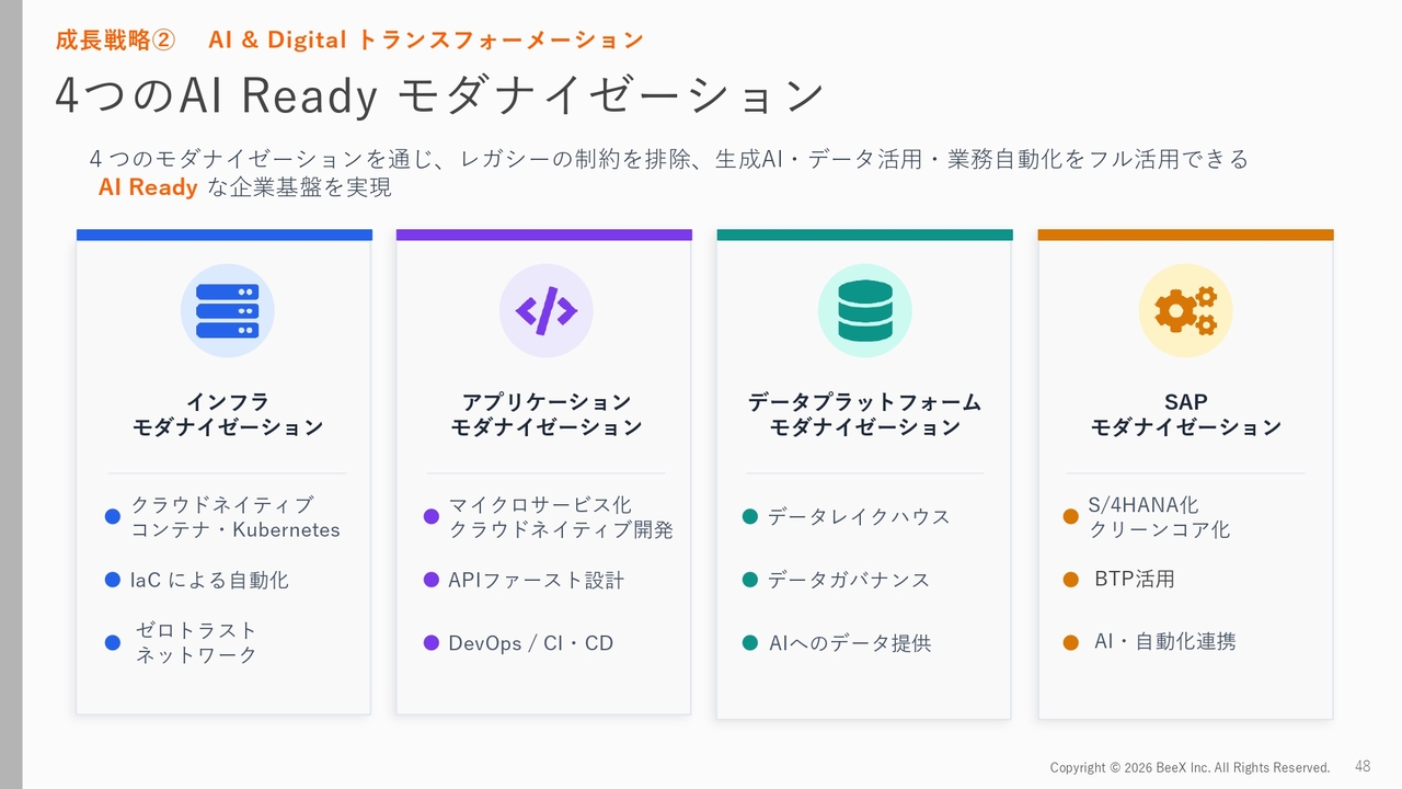 1つ目は、インフラストラクチャーのモダナイゼーションです。これは、いわゆるAI時代に対応したアプリケーションのインフラを整備するものです。従来型のオンプレミスからの移行にとどまらず、移行後のシステムをさらにAIを活用したものへと進化させたり、新しいネットワークである「ゼロトラスト」への移行を進めたりする取り組みを行っています。