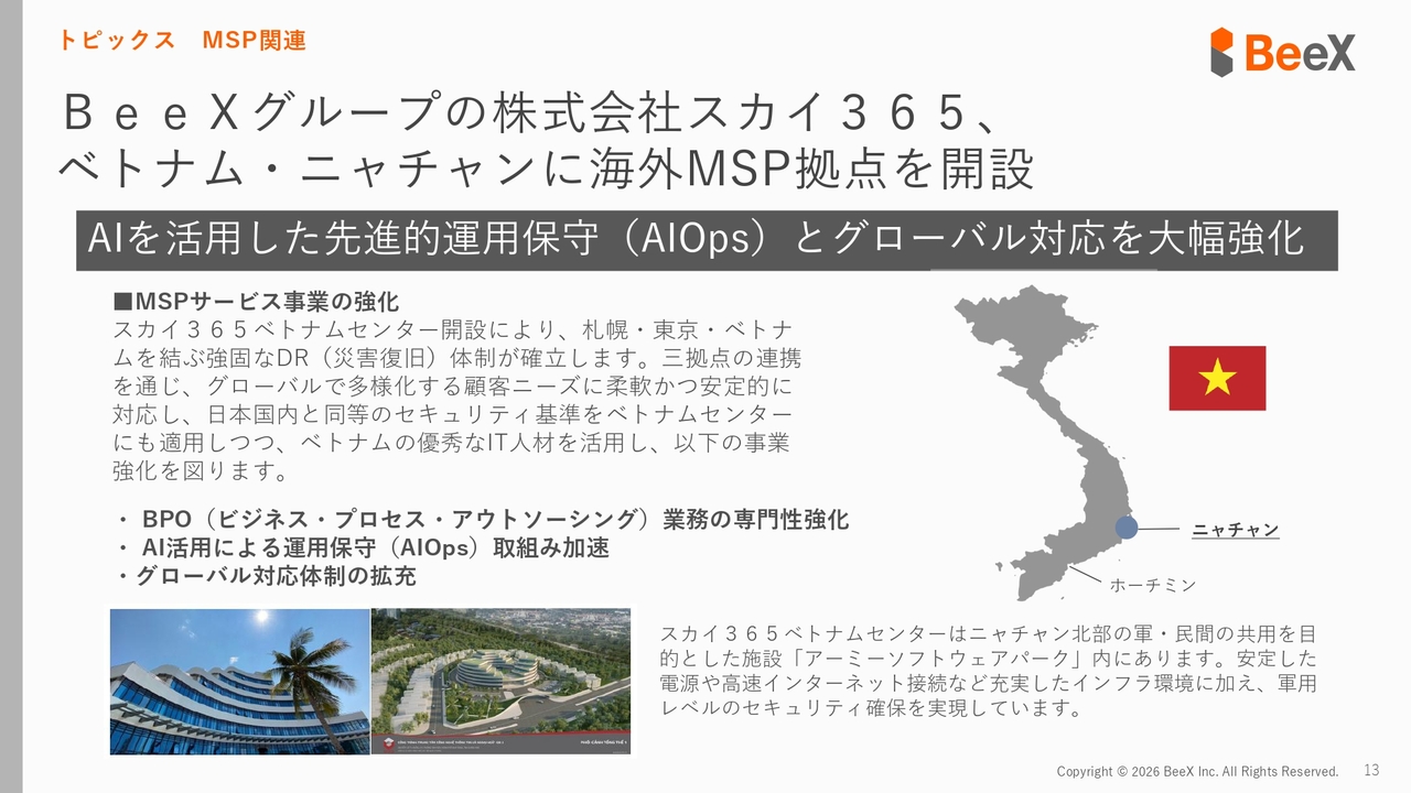 いくつかトピックスをご紹介します。最も大きなトピックスとして、MSP事業を専業とする株式会社スカイ365を子会社化したことです。特にMSPに関しては、海外展開も進めており、ベトナムにセンターを開設しています。