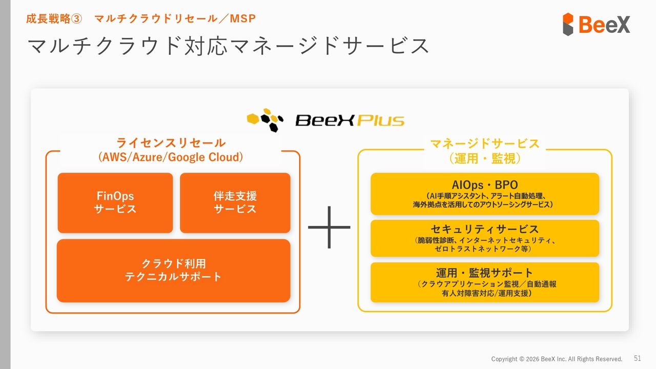 成長戦略の3番目は、マルチクラウドリセールとMSPです。ストック型ビジネスとしてご説明していますが、ライセンスリセールとマネージドサービスが当社の売上の7割以上を占めるコア部分となっています。