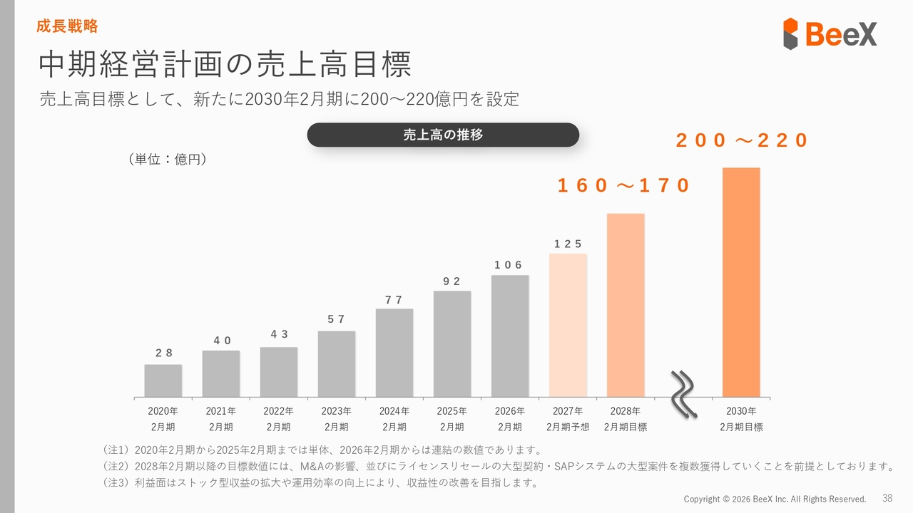新たに2030年の目標として200億円から220億円を設定しました。この目標には、先ほどお話しした「SAP」やAI、ライセンスリセールの売上を含むほか、M&Aなどへの投資も行い、達成を目指していきたいと考えています。