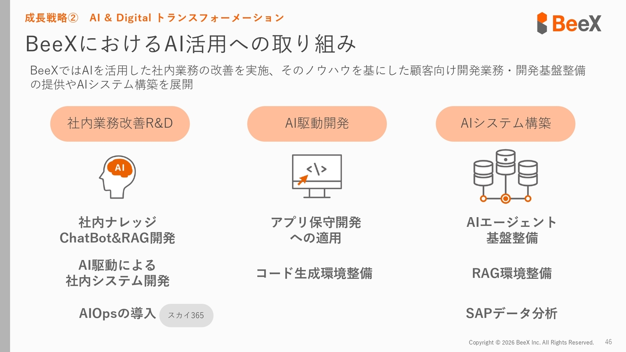 2点目の成長戦略は、AIとデジタルトランスフォーメーションになります。現在、ほとんどの企業がAIの活用に取り組み始めています。もちろん取り組み内容は企業ごとにさまざまですが、まずは我々BeeXの取り組みについて簡単にご紹介します。