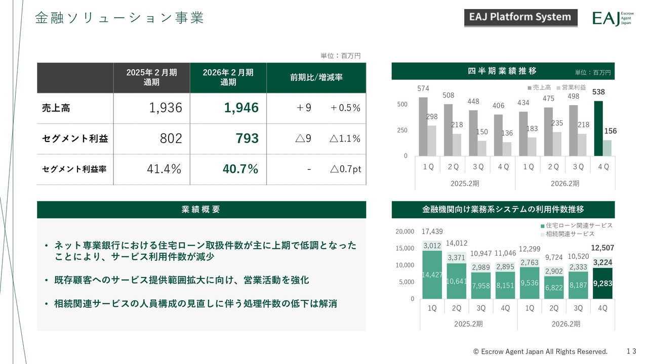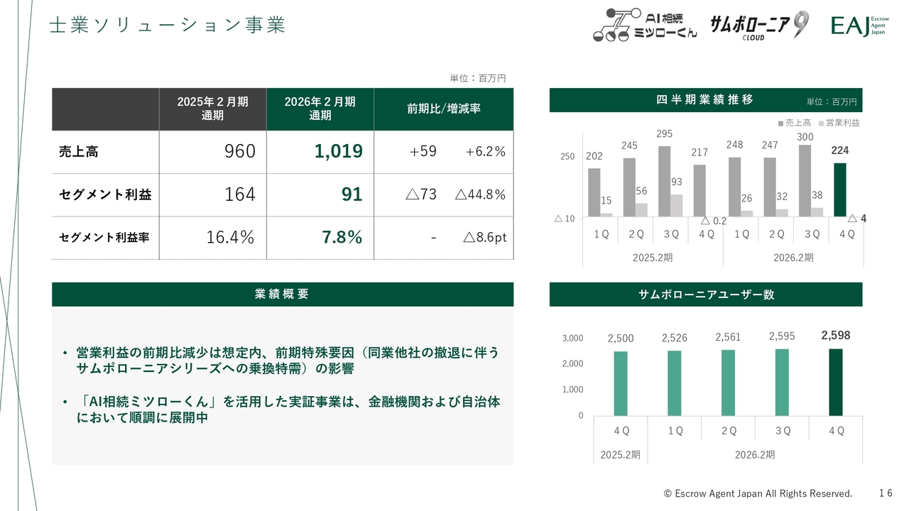 士業ソリューション事業についてです。売上高は10億1,900万円、セグメント利益は9,100万円で、増収減益となりました。営業利益の減少は、前期に発生した一時的な司法書士業務支援ソフトの需要増加の反動によるもので、当初の想定範囲内の動きとなっています。