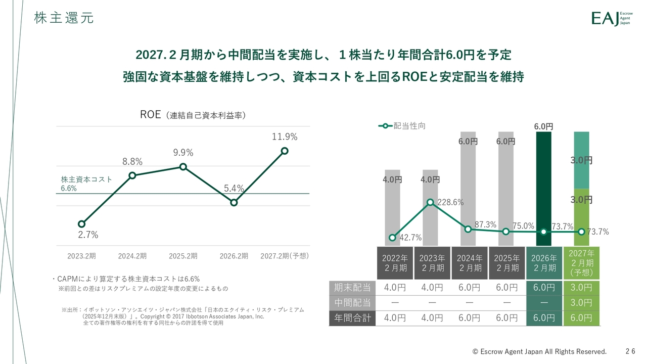 株主還元については、2027年2月期から中間配当を開始し、年間配当6円を予定しています。配当の安定性を重視しつつ、資本コストを上回るROEの維持を基本方針とし、持続的な株主還元を行います。