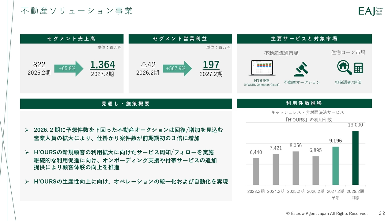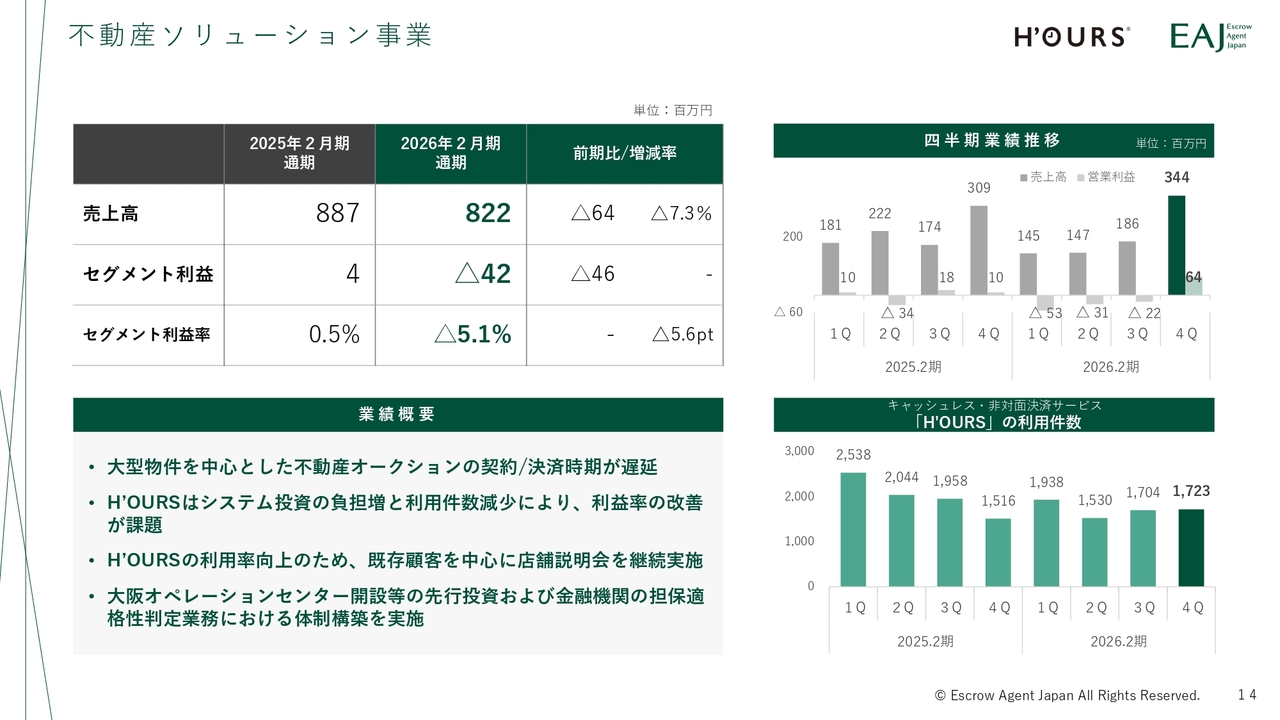 不動産ソリューション事業についてです。売上高は8億2,200万円、セグメント利益はマイナス4,200万円となり、減収減益となりました。不動産オークションの遅延に加え、「H'OURS(アワーズ)」における新システムに係る投資負担や利用件数の一時的な減少が影響しました。