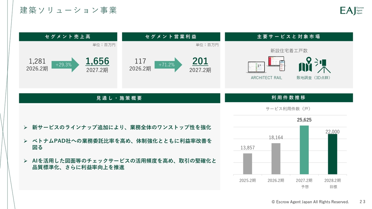 建築ソリューション事業についてです。売上高は前期比29.3パーセント増の16億5,600万円、セグメント営業利益は前期比71.2パーセント増の2億100万円で、増収増益を見込んでいます。