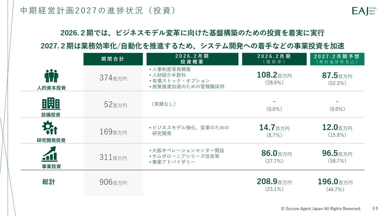 当社では、人的資本投資、研究開発投資、事業投資を中心に、将来の成長に向けた投資を進めています。2026年2月期には、基盤構築を目的とした投資を着実に実行しました。2027年2月期にはAIなどの技術を活用し、業務効率化や自動化に向けたシステム投資を中心に、さらに投資を進めていきます。