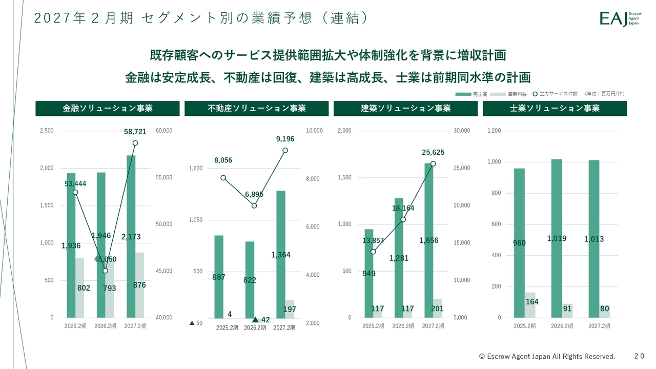 各セグメントでは、既存顧客へのサービス提供範囲の拡大と新規顧客の獲得を通じて、バランスの取れた成長を見込んでいます。特に、不動産ソリューション事業では前期の反動を受けて、大幅な回復を計画しています。
