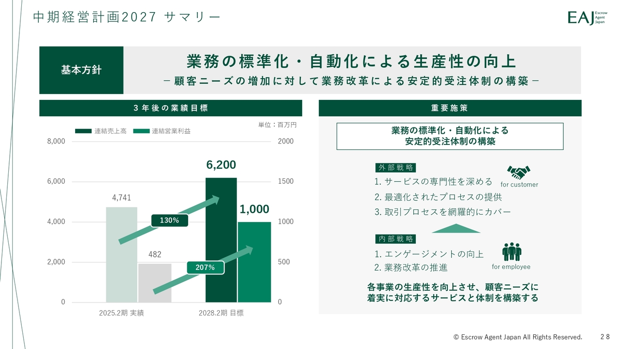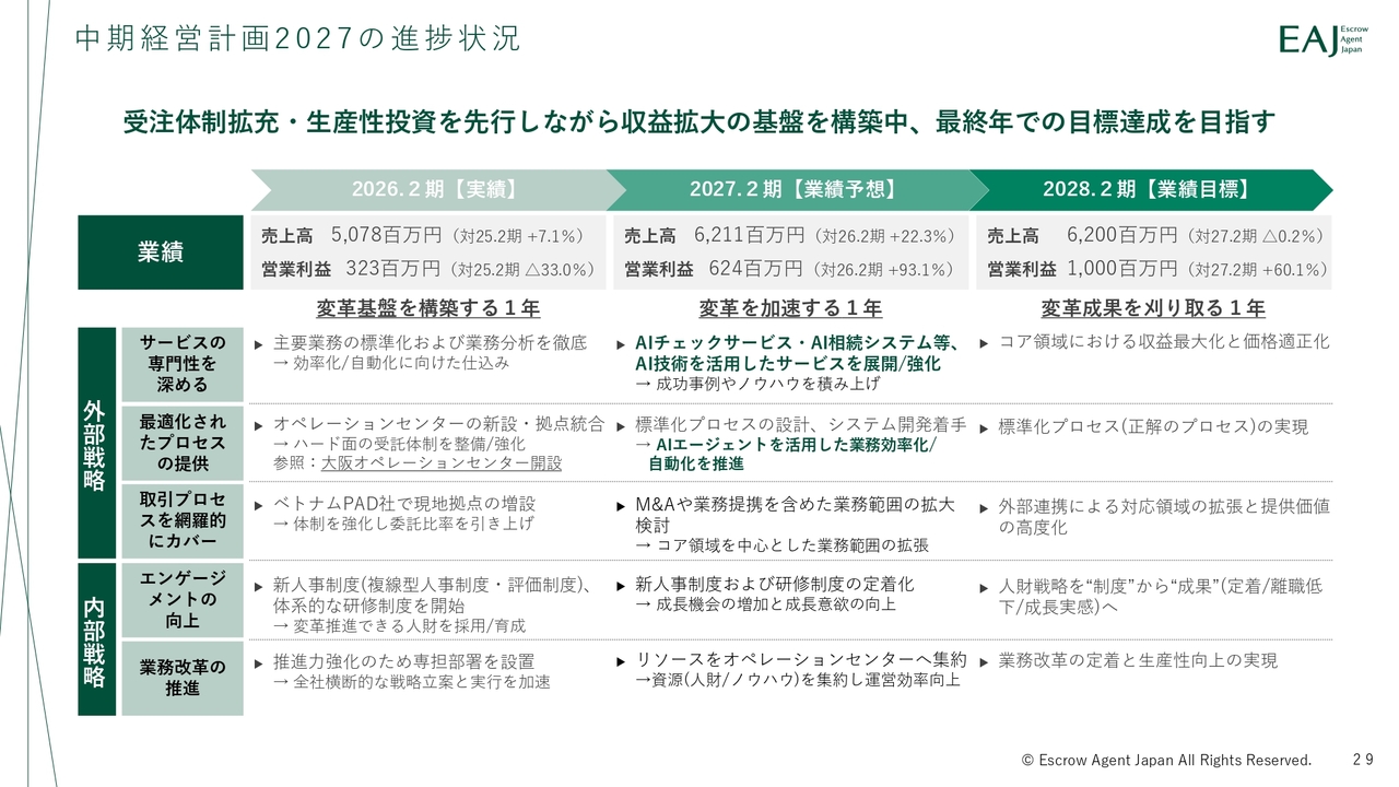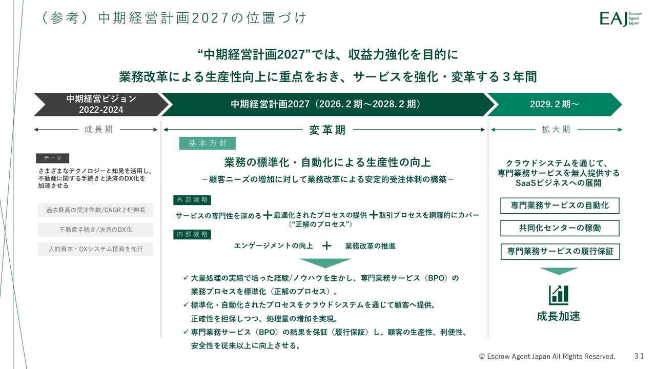 最後に、「中期経営計画2027」の進捗についてご説明します。中期経営計画では「業務の標準化・自動化による安定的受注体制の向上」を軸に据えています。顧客ニーズの増加に対応するため、業務改革を通じて安定的な受注体制を構築し、持続的な成長を実現していく方針です。